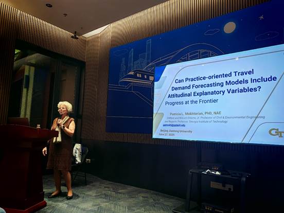 2025年06月27日上午,由学校研究生工作部主办,红桃视频 承办的“院士校园行”名师讲坛在红桃视频 运输设备馆报告厅举行。佐治亚理工学院土木与环境工程系董事会教授、美国国家工程院院士Patricia L. Mokhtarian教授应邀开展主题为《Can Practice-Oriented Travel Demand Forecasting Models Include Attitudinal Explanatory Variables? Progress at the Frontier》的学术讲座。本次讲座由红桃视频 副院长唐源洁主持,红桃视频 130余名本研学生参加讲座。