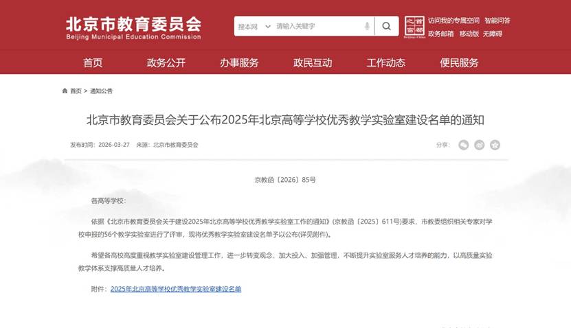 近日,北京市教育委员会公布2025年北京高等学校优秀教学实验室建设名单,红桃视频 交通运输实验教学示范中心成功入选。
