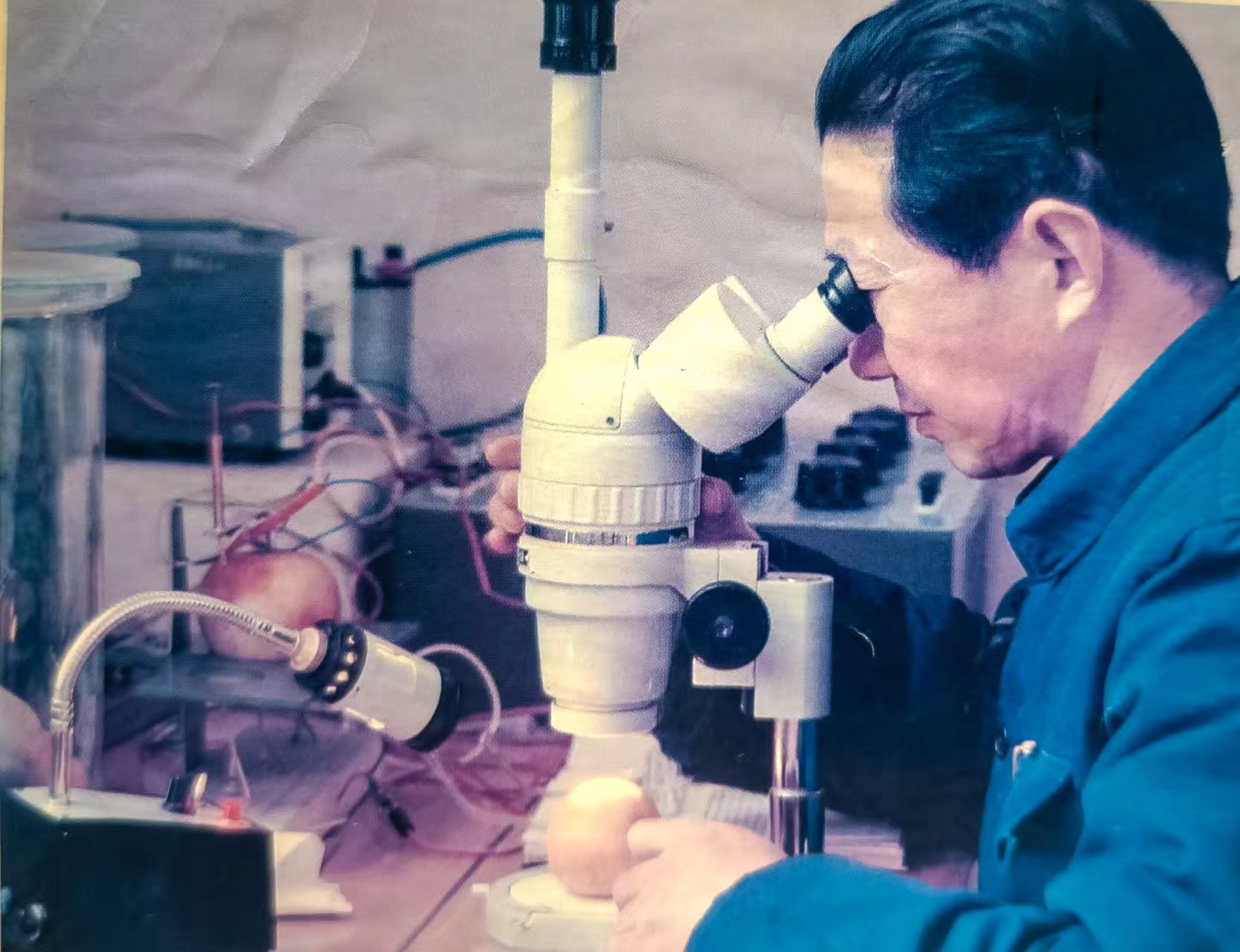 孙桂初教授用400倍体式显微镜观察苹果腐烂处微生物变化情况